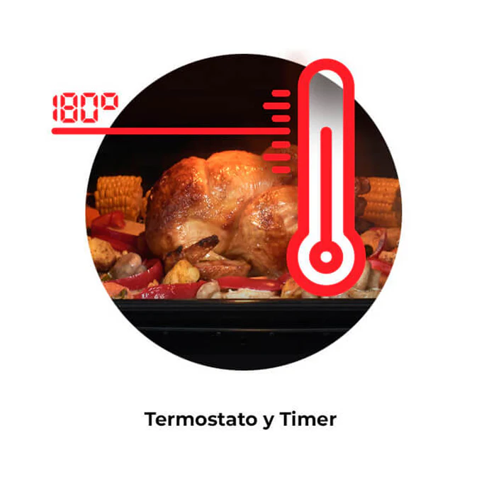 El termostato mantiene constante la temperatura del horno para lograr una cocción pareja y el timer anuncia la finalización del tiempo seleccionado.